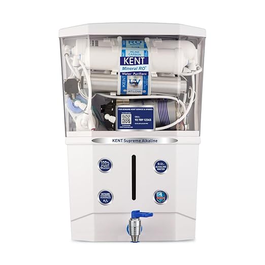 The KENT Supreme Alkaline RO Water Purifier, Advanced RO+UV+UF+Alkaline+TDS Control with 8L tank, 20 LPH purification, and UV LED in the tank; ISI & NSF Certified with 4 years free service for healthy, mineral-rich water.